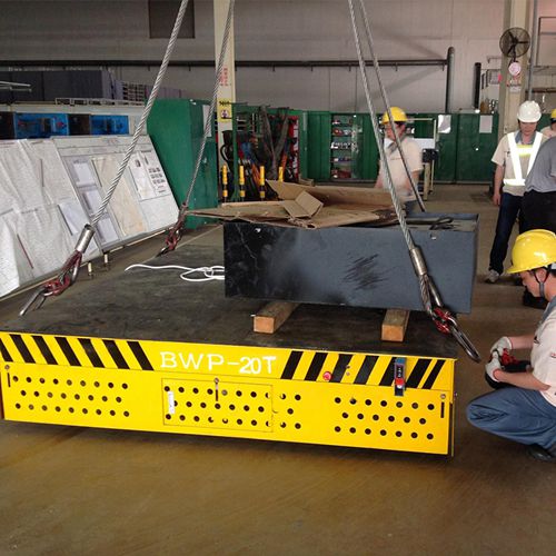 客戶(hù)需要在1號(hào)車(chē)間和2號(hào)車(chē)間廠(chǎng)房進(jìn)行往返運(yùn)行,在1號(hào)車(chē)間用重型吊車(chē)吊起模具然后放置在無(wú)軌模具車(chē)上,然后通過(guò)無(wú)軌模具車(chē)在運(yùn)輸?shù)?號(hào)車(chē)間,進(jìn)行下面的流程,運(yùn)輸距離大致在50米左右,我們?yōu)榭蛻?hù)量身定制模具轉(zhuǎn)運(yùn)車(chē)是我公司一款BWP20t 產(chǎn)品,該模具平板車(chē)具有操作靈活,360度無(wú)死角防護(hù)、遇人自動(dòng)停止等功能,既保證了車(chē)間人員的安全,又輕盈便捷將繁重的模具搬運(yùn)至目的地.