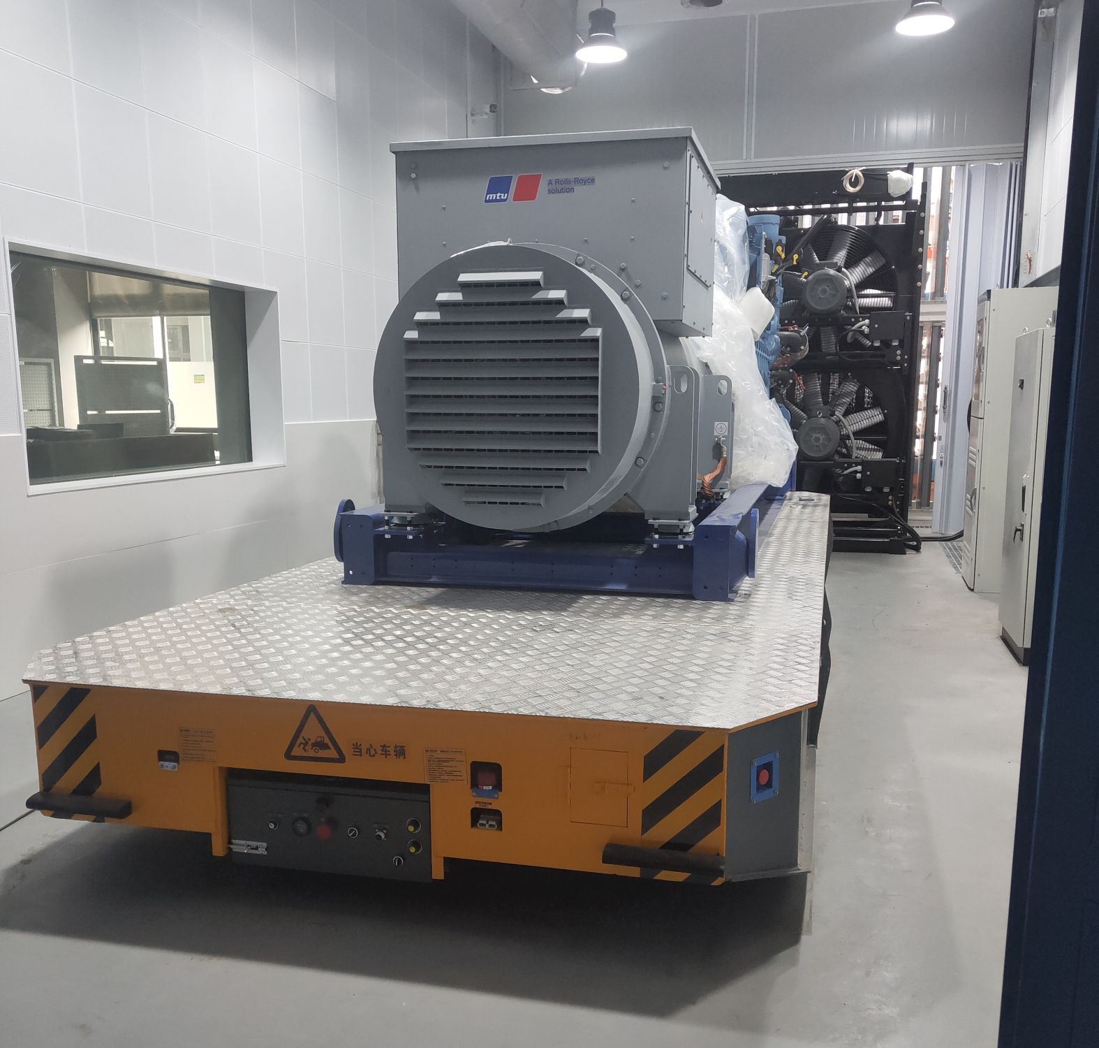 本案例是應用于發電機組廠家車間內完成產品成型后在檢測、試驗、倉儲等工位的轉運,工位處于不同車間,路途中有轉彎,有坡道;選用無軌電動轉運平車,大容量蓄電池組供電,車體規格較大,為適應現場較狹窄通道,不至于發生剮蹭通道邊其它設備狀況,車體做了倒角處理,并含有聲光報警、遇障礙物停止、觸碰式開關等安全警示裝置。