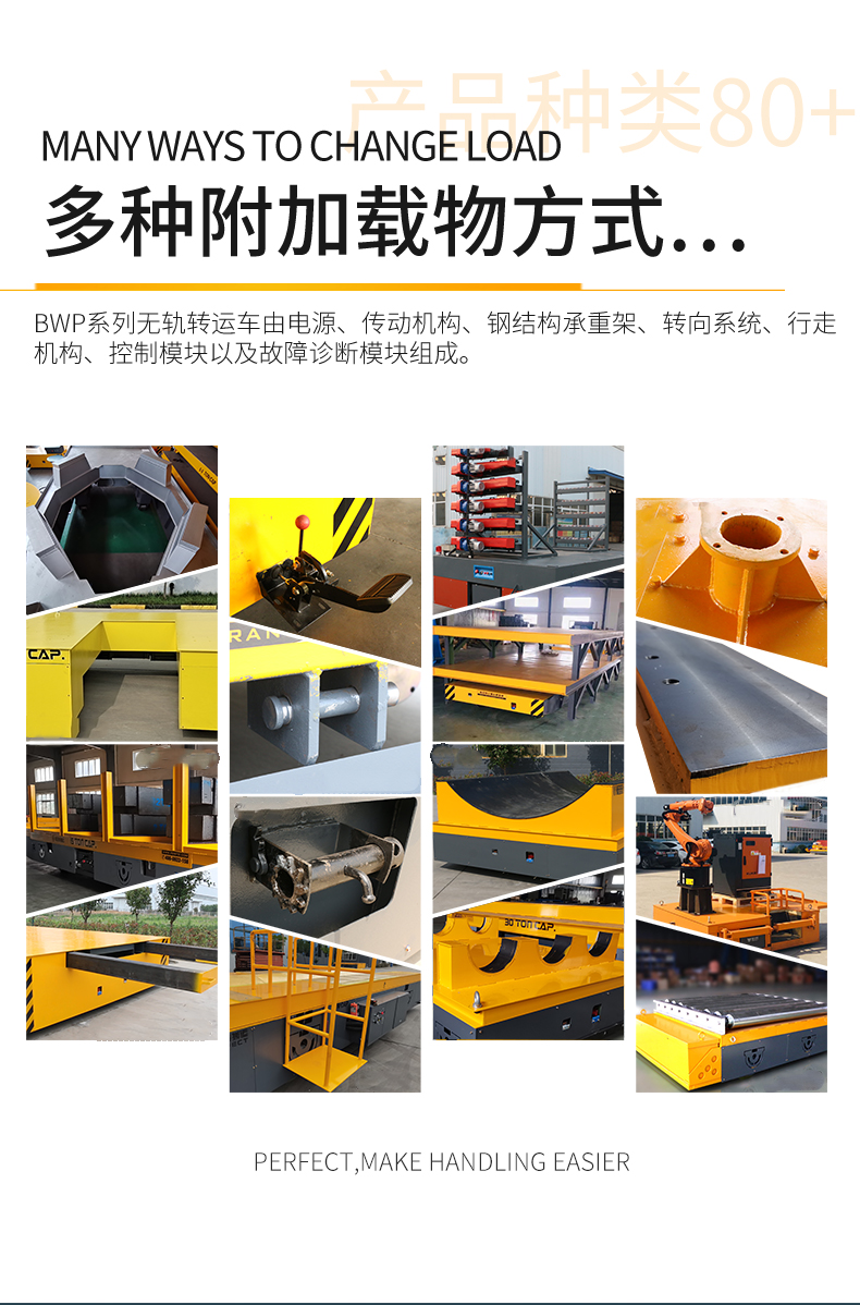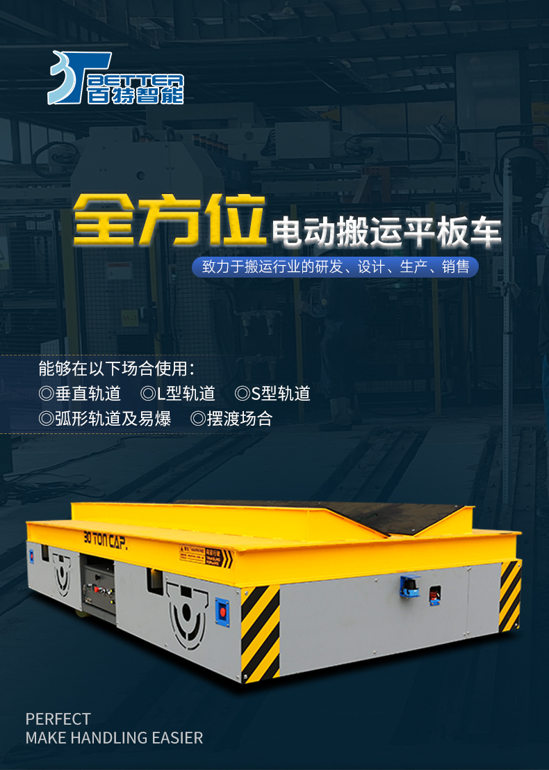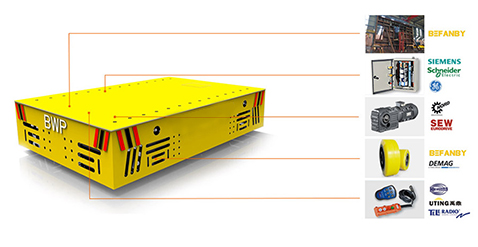 BZH型無軌搬運車是一種以蓄電池或電纜為動力源的車間內運輸車輛。又稱臺車、過跨車、地爬車。該車具有結構緊湊、操作方便、可橫縱移動、調速性能好及污染低、運輸效率高等特點。該車型外形尺寸小,也可進入空間小的倉庫、彎道完成物料運輸,可減輕工人的勞動強度,提高生產效率。作為短距離運輸工具得到廣泛應用,也可作為車間內部配合吊車運輸重物過跨之用。 該車型采用是一種以蓄電池或電纜為動力源,電壓可有24V、36V、48V、72V、110V。一般蓄電池安裝在平車內部,電源通過電氣控制系統,給電機提供電力,使平車實現啟動、