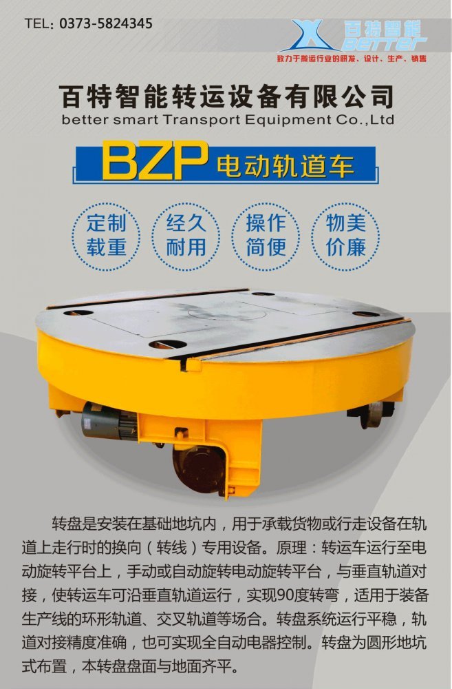 應用范圍:轉盤工作原理是:電動平車運行至轉盤上,手動或自動旋轉電動轉盤,與垂直軌道對接,將電動平車垂直于原軌道運行,實現轉彎。 轉盤系統適用于廠內空間受限,又需要平車轉彎換向的場合。新鄉市百特智能轉運設備公司生產的轉盤堅固可靠、運行平穩、設計合理、軌道對接精度高,是電動平車的好搭檔。